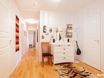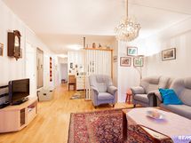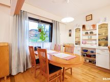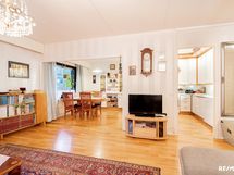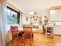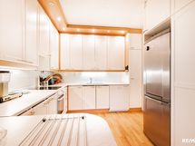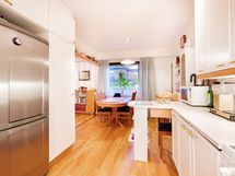 - Siisti ja tilava toiminnallinen keittiö jossa selkeä ruokatilan paikka. Ruokatila aukeaa olohuoneeseen. Jääkaappi/pakastin keraaminen liesi, astianpesukone. Lattiamateriaali on lautaparketti, seinät on tapetoitu/laatoitettu.