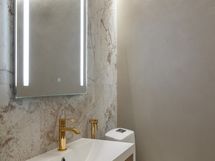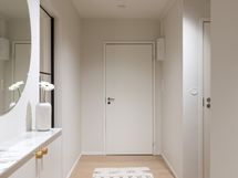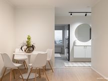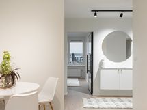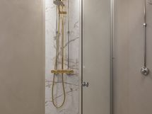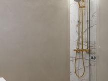 - Pesutilojen kuvaus: Kylpyhuoneessa on suurlaattaa ja mikrosementtiä. Kylpyhuone on täysin uusi. Varustus: suihkuseinä, pesukoneliitäntä, wc-istuin, suihku, peili, kylpyhuonekaapisto.