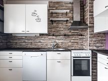 Keittiön varusteet: Jääkaappipakastin, astianpesukone, liesituuletin, uuni ja liesi. Liesi: Keraaminen liesi. Työtason materiaali: Puu.