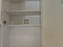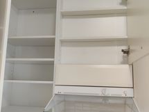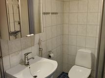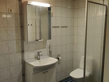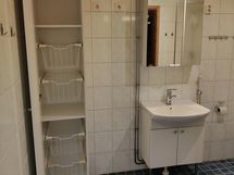 - Suihku, Suihkuseinä, Pesukonevalmius, Peilikaappi, Allaskaappi, Laattalattia, Halogeenivalot, Laattaseinä, Lattialämmitys