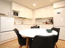 - Valkoiset keittiön kaapistot, induktioliesi, liesituuletin, astianpesukone (integroitu), jääkaappi/pakastin.