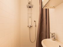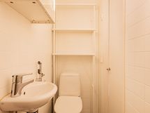 Pesutilojen kuvaus: Suihku, peilikaappi, allas, wc-istuin.