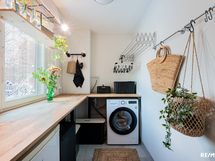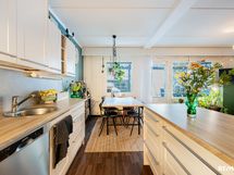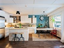 - Keittiön varusteet: Jääkaappipakastin, liesi, erillisuuni, astianpesukone, liesituuletin ja keittiösaareke. Liesi: Keraaminen liesi. Työtason materiaali: Laminaatti.