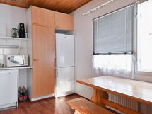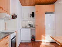 Keittiön varusteet: Jääkaappipakastin, astianpesukone, liesi, liesituuletin ja uuni. Liesi: Keraaminen liesi. Työtason materiaali: Puu.
