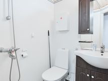 Pesutilojen varusteet: WC-istuin, bidee-suihku, pesuallas, allaskaappi, peilikaappi ja suihku.