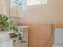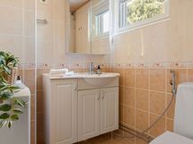 Valkoinen allaskaapisto. Wc-istuin. Kylpyhuoneen seinät ja lattia on laatoitettu, Pesukoneliitäntä.