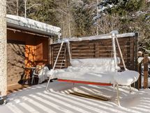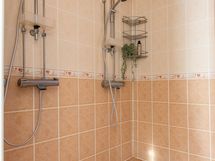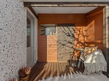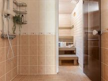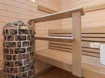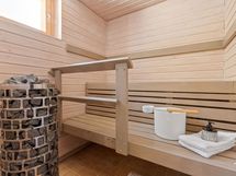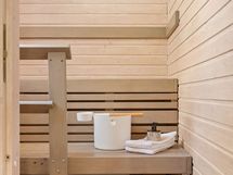 - Kuvaus: Saunan katto ja seinät on valkolakattua kuusipaneelia. Harmahtavan sävyiseksi käsitellyt lauteet. Sawon pilarikiuas (sähkö). Ikkuna.