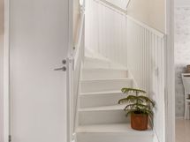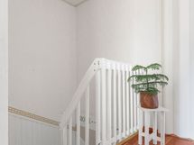 Katto on valkoiseksi maalattu betonia. Seinät on tapetoitu/maalattu.
