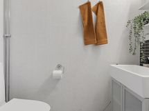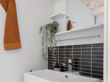 - Pesutilojen kuvaus: Katto on lämpökäsiteltyä paneelia. Valkoinen peilikaappi valolla.