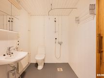 - Pesutilojen varusteet: WC-istuin, suihku, peilikaappi, pesuallas ja pesukoneliitäntä. Pesutilojen kuvaus: Kylpyhuone on kokonaan laatoitettu, katto paneloitu. Kylpyhuoneessa wc-istuin, pesukoneliitäntä, käsienpesuallas sekä peilikaappi.