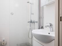 - Pesutilojen kuvaus: Varustus: suihkuseinä, pesukoneliitäntä, wc-istuin, suihku, peilikaappi. Lattia: muovi. Seinät: kaakeli.