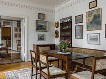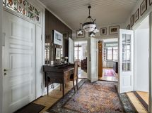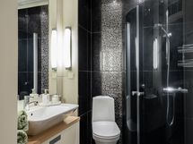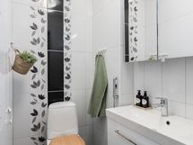 - Pesutilojen varusteet: WC-istuin, peili, allaskaappi, pesuallas, suihkuseinä, bidee-suihku ja suihku. Erillisten WC:n lukumäärä: 2. Erillisen WC:n varusteet: WC-istuin, pesuallas, allaskaappi ja peilikaappi. Erillisen WC:n kuvaus: Pikku-wc työhuoneen vieressä: laattalattia, wc-pönttö, pesuallas, seinät maalattu.