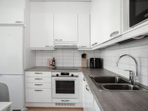 Valkoiset kaapistojen ovet, tummat laminaattitasot. Jääkaappi/pakastin, keraaminen liesi, liesituuletin, astianpesukone