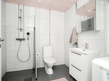 Pesutilojen kuvaus: Kph laatoitettu, lattialämmitys. Suihku, suihkuseinä, allaskaappi, kaappi, peilikaappi, pk-liitäntä.