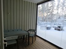 - Olohuoneesta käynti sisäpihan suojaisalle katetulle terassille jossa sivuun liukuvat lasiovet