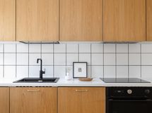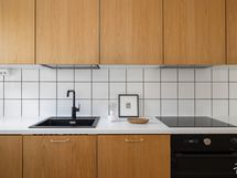 Integroitu astianpesukone, korkea valkoinen jääkaappi-pakastin. Mikrolle on varattu paikka keittiökaapiston sisään. Induktioliesi ja liesituuletin. Erillisuuni (höyry-/pyrolyysitoiminnot).