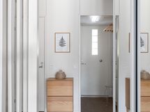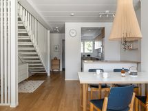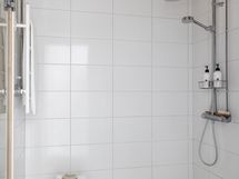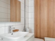 - Pesutilojen kuvaus: Yläkerran pesuhuoneen seinät on laatoitettu valkoisilla seinälaatoilla. Lattiassa on