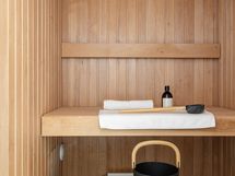 - Kuvaus: Saunan seinät ja katto on paneloitu tervaleppäpaneelilla. Tervaleppälauteet. Saunan valaisimet ovat selkänojan taustassa.