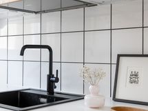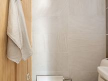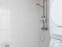 Sadesuihku, kuivauspatteri seinässä, pesutornille paikka. Kph:n ledit ovat himmentimellä.