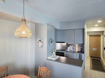 Keittiön varusteet: Jääkaappipakastin, uuni, liesi ja lieden uuni varustettu mikroaaltotoiminnolla. Liesi: Keraaminen liesi ja sähkö/mikroaalto yhdistelmäuuni. Työtason materiaali: Puu. Laminaatti.