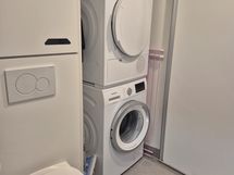 Pesutilojen varusteet: Suihku, kuivausrumpu, wc-istuin, pesukone, kaapisto pesukoneelle ja kuivausrummulle, pesuallas, allaskaappi ja bidee-suihku.