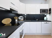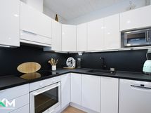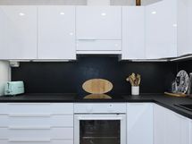 Jääkaappi/pakastin, induktioliesi, erilluuni, liesikupu/-tuuletin, astianpesukone, kaapistot