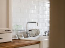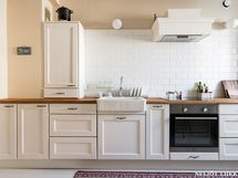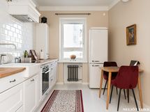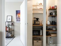 Keittiön varusteet: Jääkaappipakastin, liesituuletin (suodatin), erillisuuni (kiertoilmauuni) ja astianpesukone (Integroitu). Liesi: Induktioliesi. Työtason materiaali: Puu. Ihana aamiaiskaappi, tehty vanhoihin ruokakomeroihin.