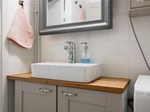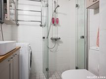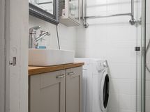 Pesutilojen varusteet: Suihkuseinä, pesukoneliitäntä, wc-istuin ja suihku.