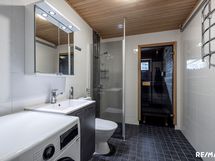 - Pesutilojen kuvaus: Suihku, suihkuseinä, peilikaappi, allaskaappi, pesukoneliitäntä, sähköinen lattialämmitys, vesikiertoinen kuivauspatteri, Lattia: laatta, Seinät: laatta