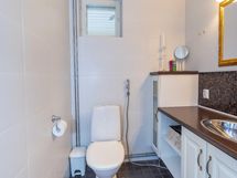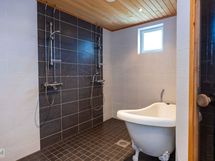Suihku/suihkukaappi, amme, peilit, kiinteät valaisimet, kylpyhuonekaapisto, pesukoneliitäntä, lattialämmitys, erillinen wc, sähkösauna