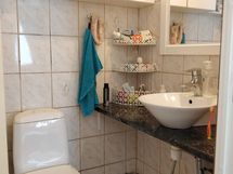 Pesutilojen varusteet: Suihku, pesukoneliitäntä ja lattialämmitys. Pesutilojen kuvaus: Pesuhuone uusittu v. 2015. Erillisten WC:n lukumäärä: 1. Erillisen WC:n varusteet: Pesuallas, peili ja wc-istuin.