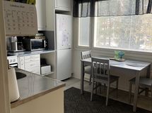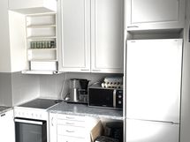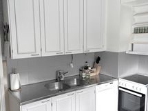 - Suuri tiskipöytä, Terästasot, Laminaattitasot, Astianpesukone, Keraaminen liesi, Liesituuletin, Jääkaappi. Keittiön kaappien ovet maalattu ja vetimet uusittu.