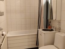 Pesutilojen varusteet: WC-istuin, suihku, pesukoneliitäntä, peilikaappi, pesuallas, allaskaappi ja bidee-suihku. Pesutilojen kuvaus: Kylpyhuone on jossain vaiheessa remontoitu kokonaan. Amme on tällöin ensin poistettu, lattia sekä seinät on kokonaan uusittu ja sen jälkeen amme nostettu takaisin.