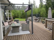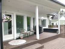 Talon takana sijaitseva iso terassi, osittain katettu, on täydellinen paikka vapaa-ajan viettoon ja ulkoporeallas tuo ripauksen ylellisyyttä. Erillinen lämmin autotalli/verstastila on todellinen monitoimitila, jossa on korkeaa työskentelytilaa, tilaa autoille sekä erillinen wc:llä varustettu huonetila, joka sopii esimerkiksi etätyöpisteeksi tai nuoren ensiasunnoksi.