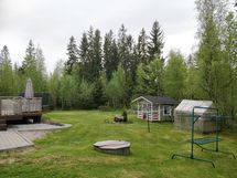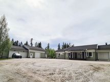 Pihasta löytyy sekä nurmikkoa että sorapihaa, ja rakennusten edustalla on siisti laatoitus.