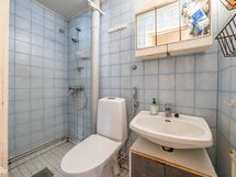 Pesutilojen kuvaus: Suihku, käsienpesuallas, allaskaappi, peilikaappi, wc-istuin. Laattalattia ja seinät laattaa.