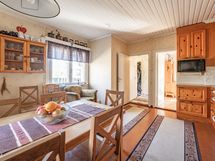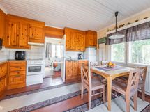 Kaapisto: puupeiliovet, laminaattitasot. Kodinkoneet: jääkaappi/pakastin, keraaminen liesi, liesituuletin, astianpesukone. Puulattia ja seinät tapettia.