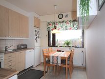 - Tilaa isolle ruokapöydälle, Paljon kaappitilaa, Paljon työskentelytilaa, Suuri tiskipöytä, Lasikaapit, Laminaattitasot, Astianpesukone, Pesukoneliitos, Integroidut koneet, Sähköliesi, Liesituuletin, Jääkaappi, Pakastin