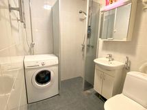 Lattia laatta, seinät kaakeli. Pesukoneliitäntä, suihkuseinä, allaskaappi.