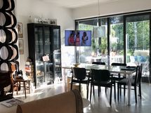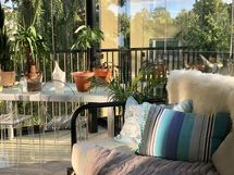 - Paljon ikkunoita, Sälekaihtimet, Korkeat ikkunat, parvekkeella mustat rullaverhot.