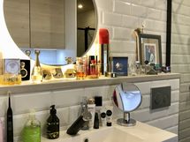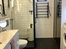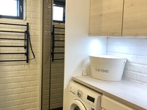 - Suihku, Suihkukaappi, Pesukone, Kuivausrumpu, Rättipatteri, Laattaseinä, Lattialämmitys, suihkukulma(Hietakari New York) kuivaava pesukone, peilikaappi, laattalattia, laattaseinät, allaskaappi, kuivauspatteri(ajastimella), halogeenivalot, avattava ikkuna, lattialämmitys(vesikiertoinen)työtaso(lev.120 cm) ylä-ja alakaapisto, siivouskaappi, pyykkikaappi(lankakorit+hyllyjä)