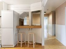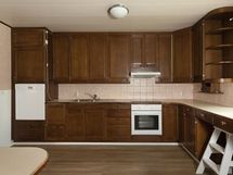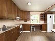 Jääkaappi, pakastekaappi, erillisuuni, liesitaso, sähköliesi, liesituuletin, astianpesukone, kaapistot, kiinteät valaisimet.