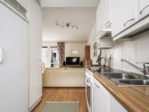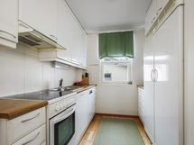 - Keittiön varusteet: Jääkaappi, pakastinkaappi, astianpesukone, liesi ja liesituuletin. Liesi: Keraaminen liesi. Työtason materiaali: Laminaatti.