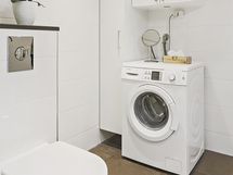 Varusteet: peilikaappi, allaskaappi, sadesuihku, suihkuseinä, wc-istuin, pesukoneliitäntä, likapyykkikaappi, säilytyskaapisto, halogeenivalot, rättipatteri, lattialämmitys.
