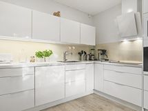 Paljon kaappitilaa ja työskentelytilaa, suuri tiskipöytä, laminaattitasot, integroitu astianpesukone, liesituuletin, induktioliesi, integroitu uuni ja mikroaaltouuni, jääkaappi, pakastin.