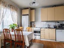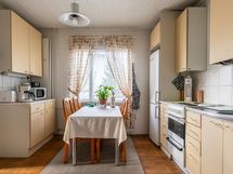 Keittiön varusteet: Jääkaappipakastin, astianpesukone, liesi, liesituuletin ja kiinteät valaisimet. Liesi: puuliesi, sähköliesi. Työtason materiaali: Laminaatti.