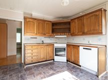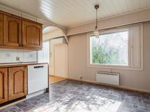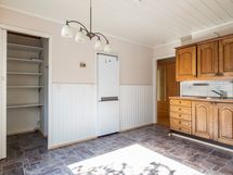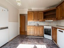 Keittiön varusteet: Jääkaappipakastin, astianpesukone, liesi ja liesituuletin. Työtason materiaali: Laminaatti.