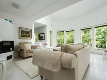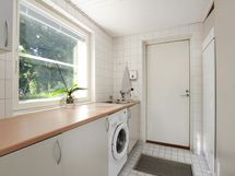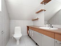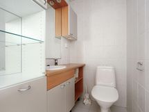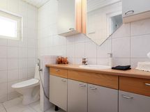 - Pesutilojen kuvaus: Saunan pesuhuoneessa kiva erkkeri tilava taso, himmeät lasitiili-ikkunat. . Varustus: lattialämmitys, suihku, kiinteät valaisimet. Erillisen WC:n kuvaus: Kaikissa wc-tiloissa kaapistot. Varustus: peilikaappi, bidee-suihku.