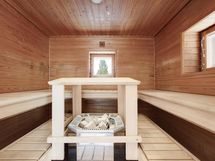 - Kuvaus: Saunassa lauteet kiertää u-muodossa kiukaan ympärillä, tilaa useammallekin saunojalle. sähkökiuas