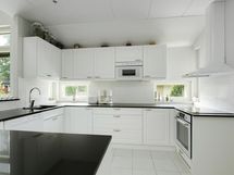 - Liesi: induktio, erillisuuni. Kylmäsäilytys: jääkaappi, pakastin. Varustus: mikroaaltouuni, astianpesukone, kiinteät valaisimet, liesituuletin / hormi. Kylmäkeskus on kotikylmiö. Työtasot: kvartsikomposiittia, Caesarstone Jet Black 3100.